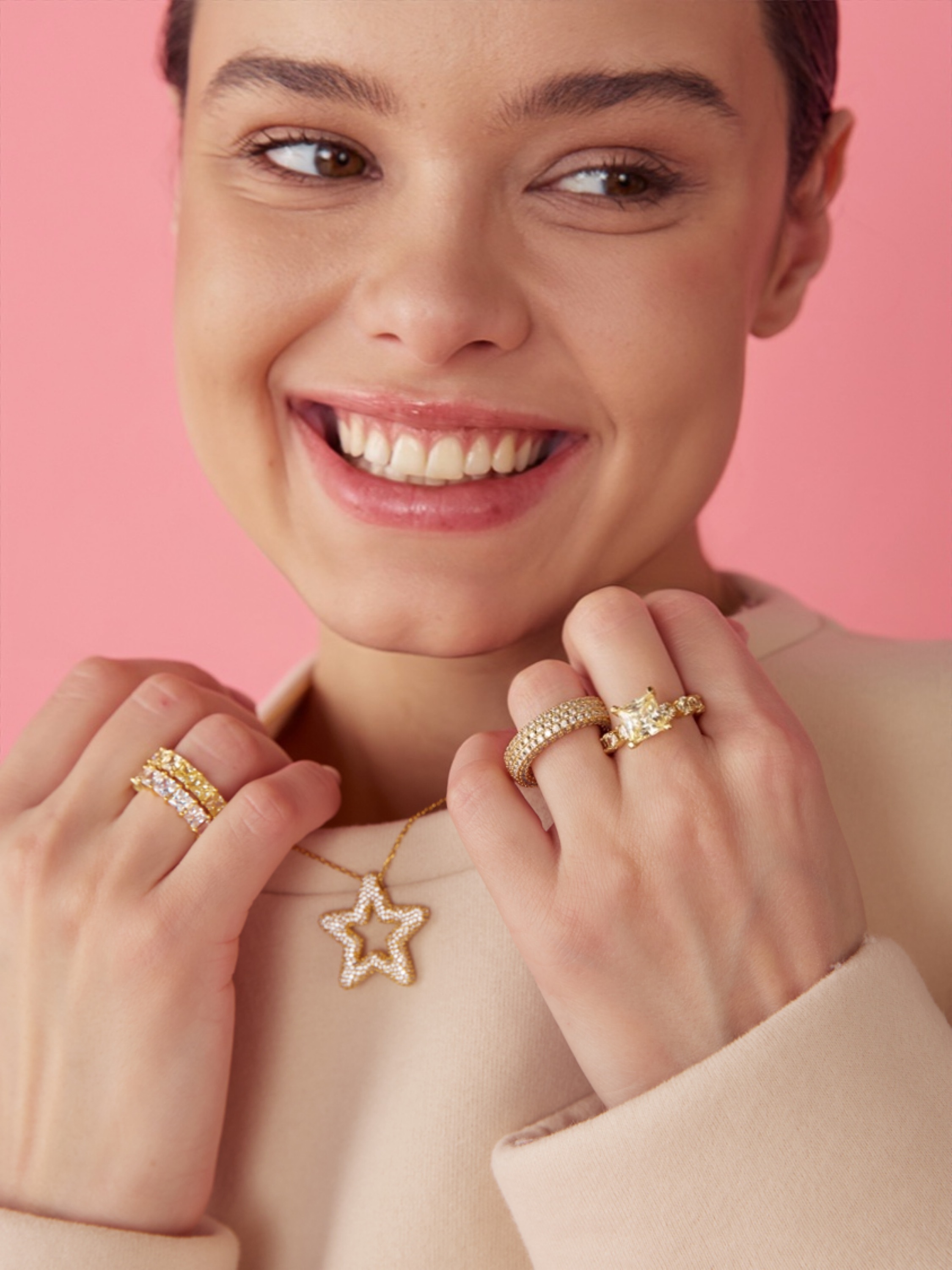 Украшения коллекции MAKE A WISH выполнены из латуни, покрыты родием и позолотой, со вставками из кубических циркониев.