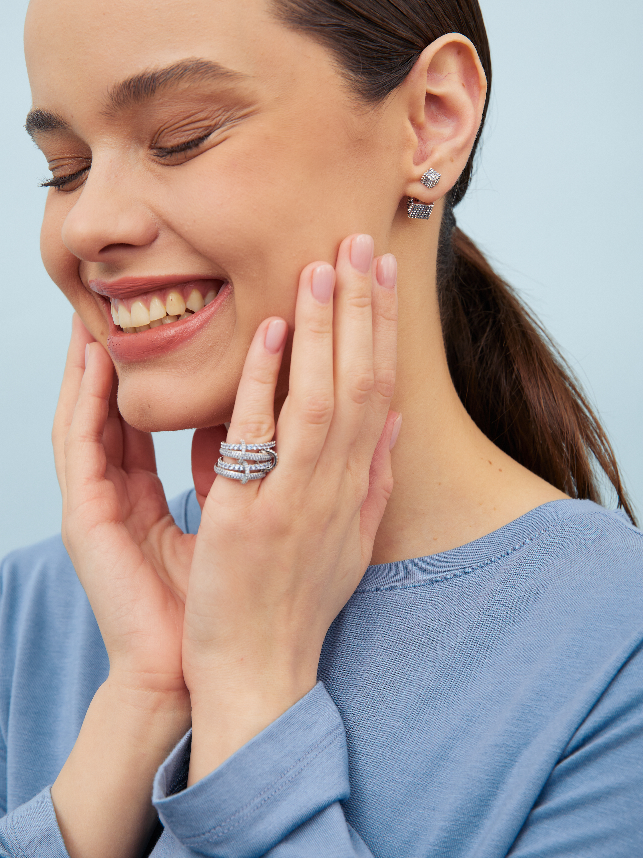 В наших сияющих изделиях у круглых камней высшая категория огранки - бриллиантовая, которая содержит 57 граней.